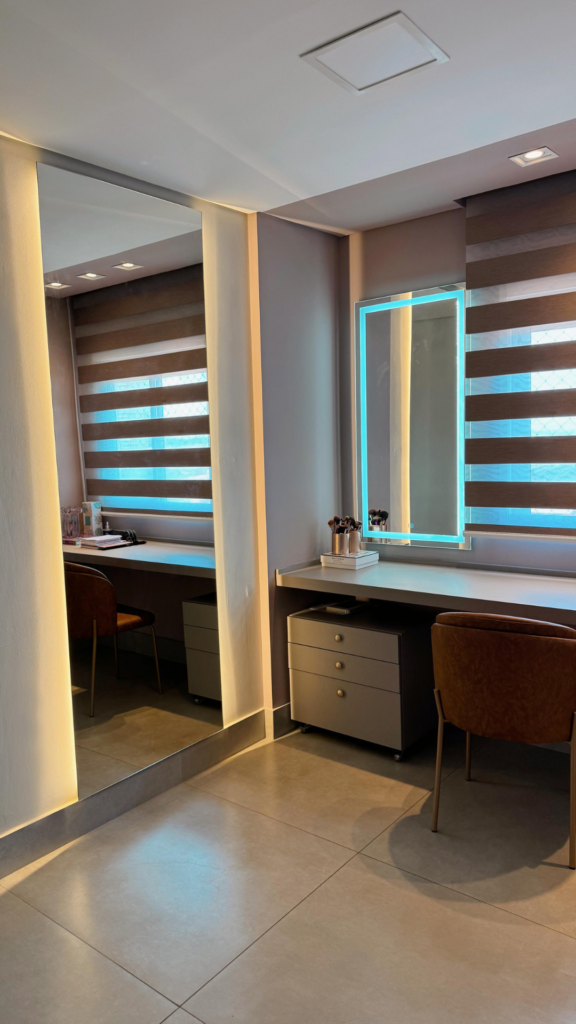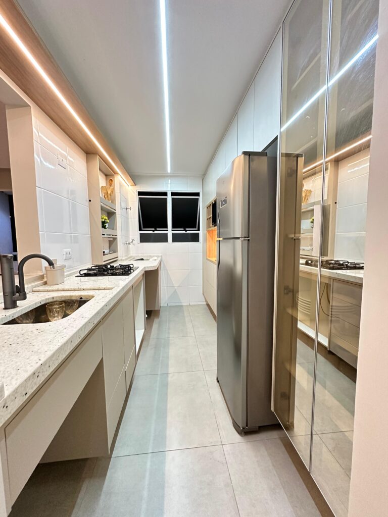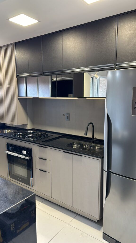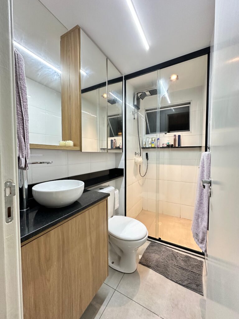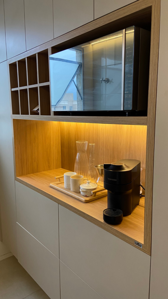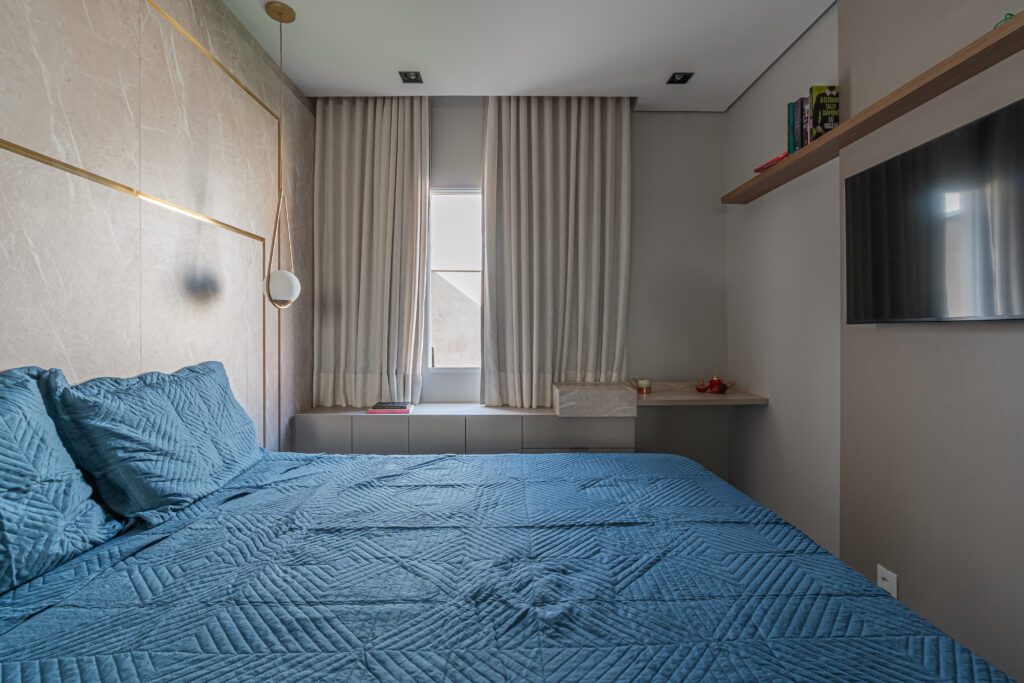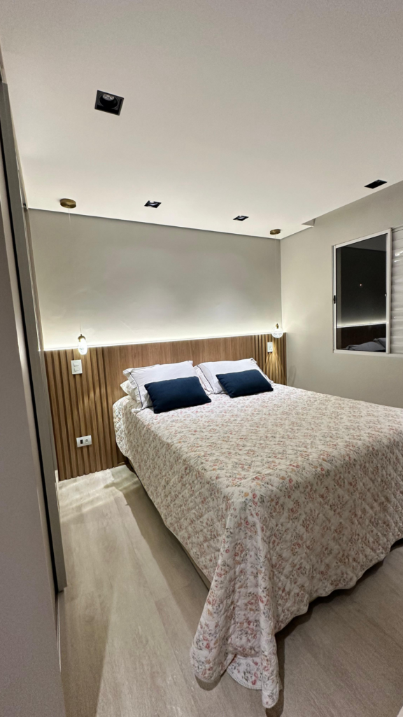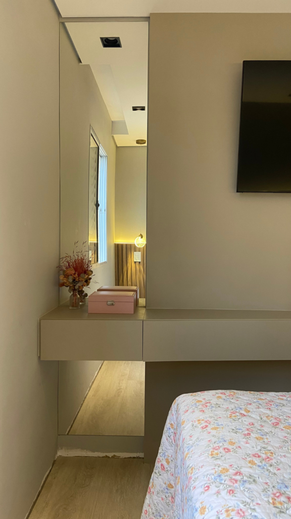 Na cozinha, o desejo por uma península foi o ponto de partida — e também o coração da transformação. No quarto, a missão era unir conforto e muito espaço de armazenamento, sem abrir mão da estética. E no banheiro, a sofisticação veio nos detalhes. Cada escolha aqui respeita a rotina dela, que trabalha em casa, e dele, que chega do trabalho buscando aconchego. Um projeto que prova que é possível ter um lar funcional, sofisticado e, acima de tudo, com a personalidade de quem vive ali.