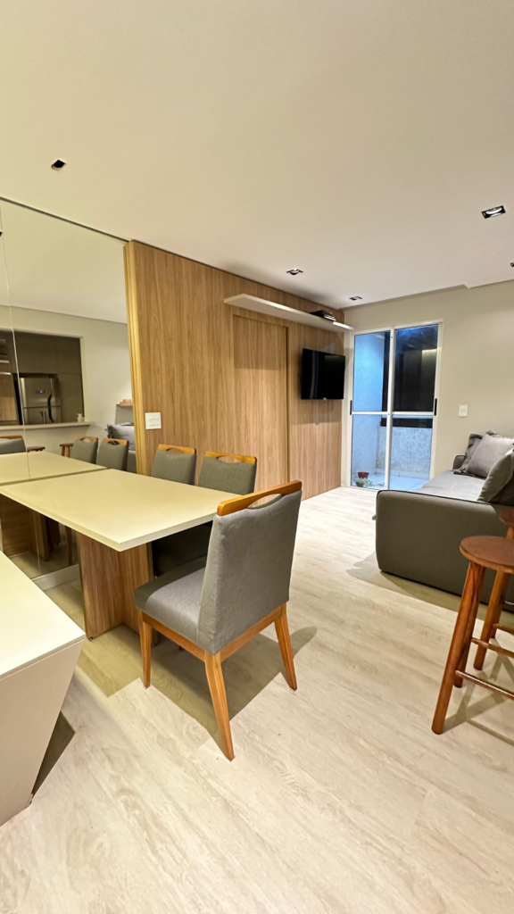 Tínhamos um desafio nas mãos, acomodar todos os itens necessários que o casal pediu em cada ambiente, de forma funcional, aproveitando cada centímetro que tínhamos disponível. Os grandes destaques são: o aproveitamento de uma parede toda da cozinha destinada a armazenamento; não ter rack na sala e sim apenas uma prateleira na altura da porta, o que facilitou a circulação e trouxe leveza pro ambiente; o banco no lugar das cadeiras na sala de jantar, ele é também um baú para armazenamento; o armário extra no escritório.